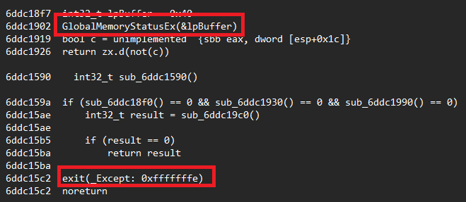 PDFSIDER features a multi-stage environment validation routine designed to detect sandboxes, virtual machines (VMs), and analysis labs. The malware uses the GlobalMemoryStatusEx function to assess the system's total RAM, with low-RAM systems (commonly associated with sandboxes or virtual environments) triggering an early exit.