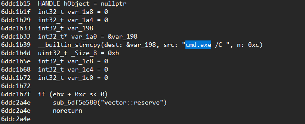 The malware provides full remote command execution upon launch, performing several actions. It creates anonymous pipes and constructs a command string using cmd.exe /C <attacker-supplied command>.
