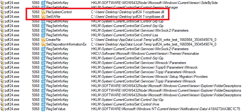 When the victim runs the legitimate program, The PDF24.exe loads the attacker’s DLL instead of the real system cryptbase.dll, granting code execution.