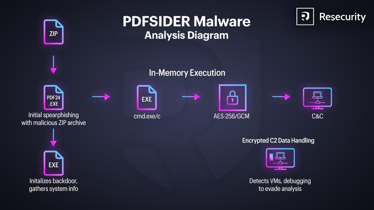 The malware is identified as an Advanced Persistent Threat (APT), having characteristics commonly associated with APT tradecraft, including stealthy execution, anti-VM checks, and encrypted communications. PDFSIDER blends traditional cyber-espionage behaviors with modern remote-command functionality, enabling operators to gather system intelligence and remotely execute shell commands covertly.